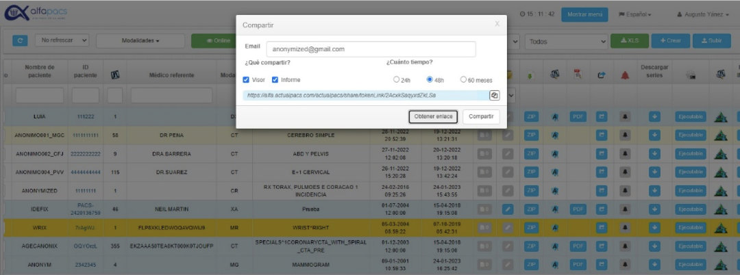 Con el fin de maximizar los ahorros para el Centro Médico y mejorar la experiencia de los pacientes, ActualPacs cuenta con un módulo de compartición, el mismo permite compartir los estudios por medio de correo electrónico y WhatsApp.